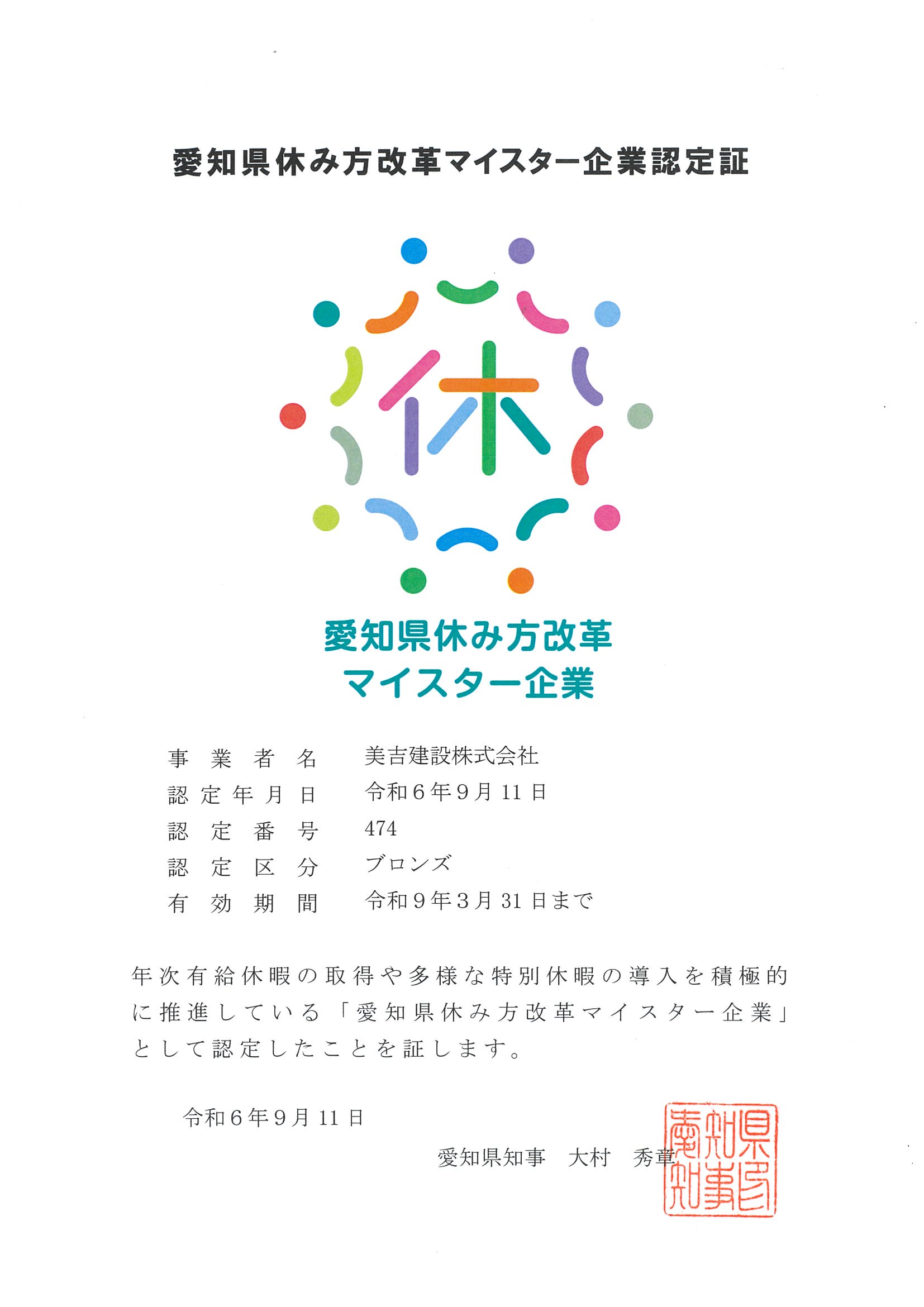 当社の有給取得率が60%を超え(67.2%)、「愛知県休み方改革マイスター企業」に認定されました!