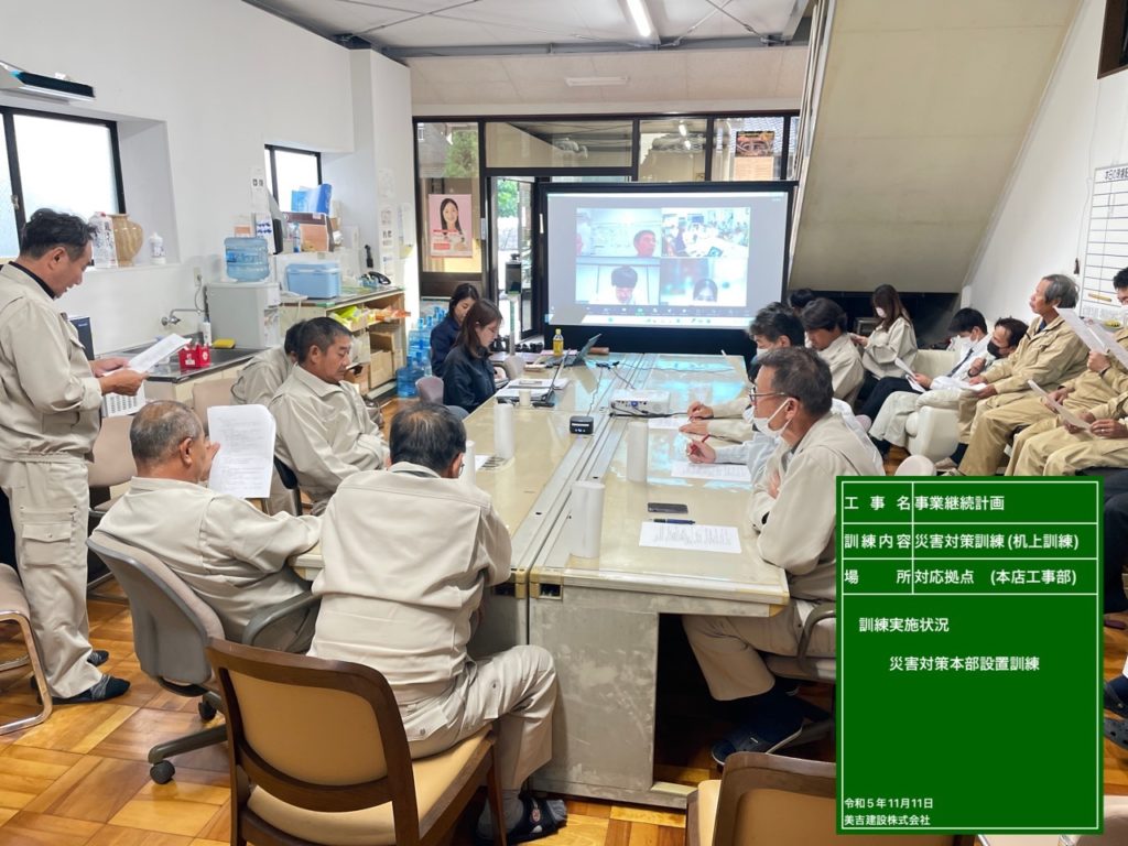 その後の地震災害机上訓練では、震度6強の地震発生を想定し、災害時の全体の動き・流れの確認、安否・被災状況確認などを実施しました。