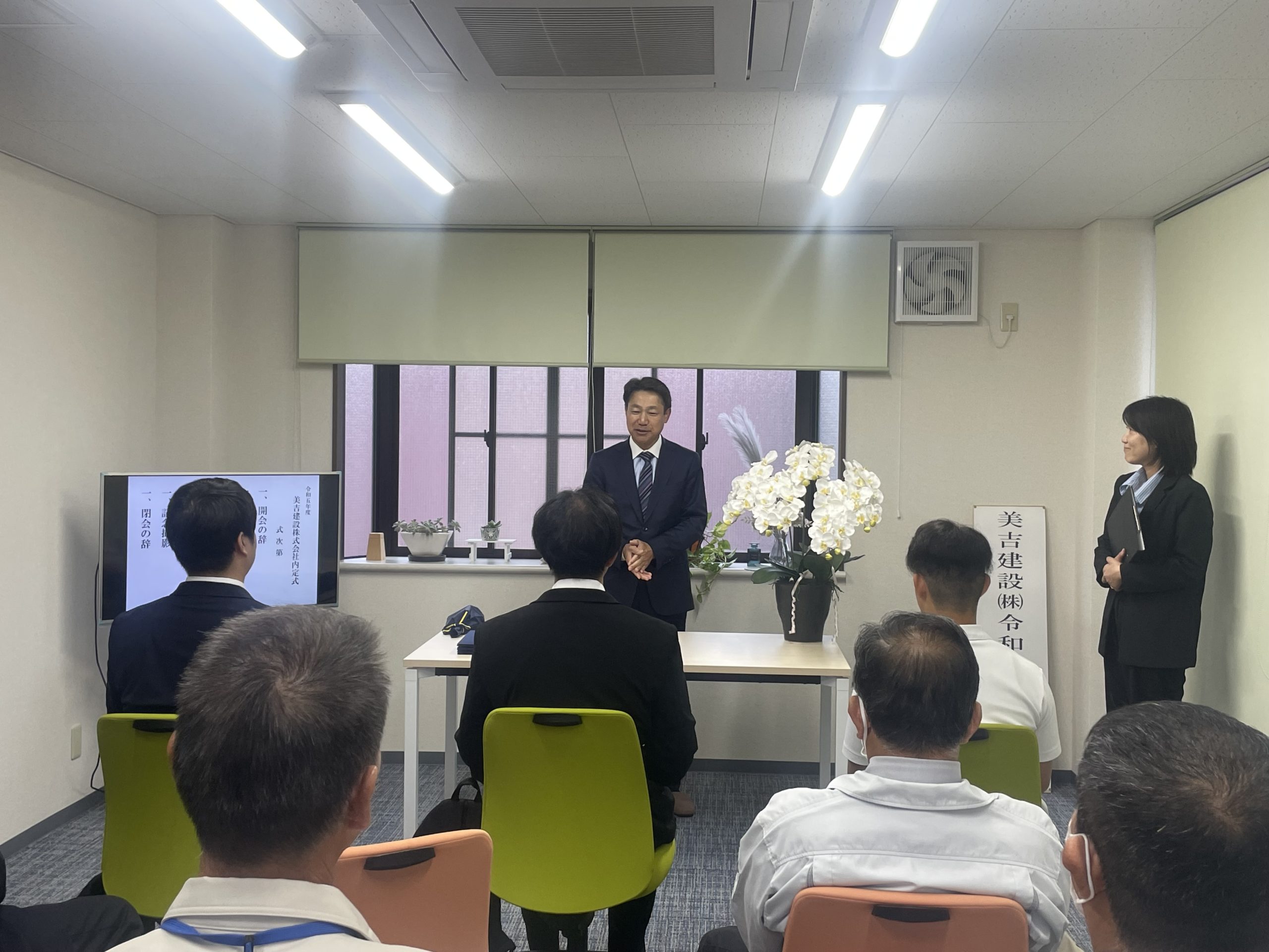 社長の挨拶をはじめ、社員からの挨拶と歓迎の言葉に続き、内定者の皆さんの自己紹介。
