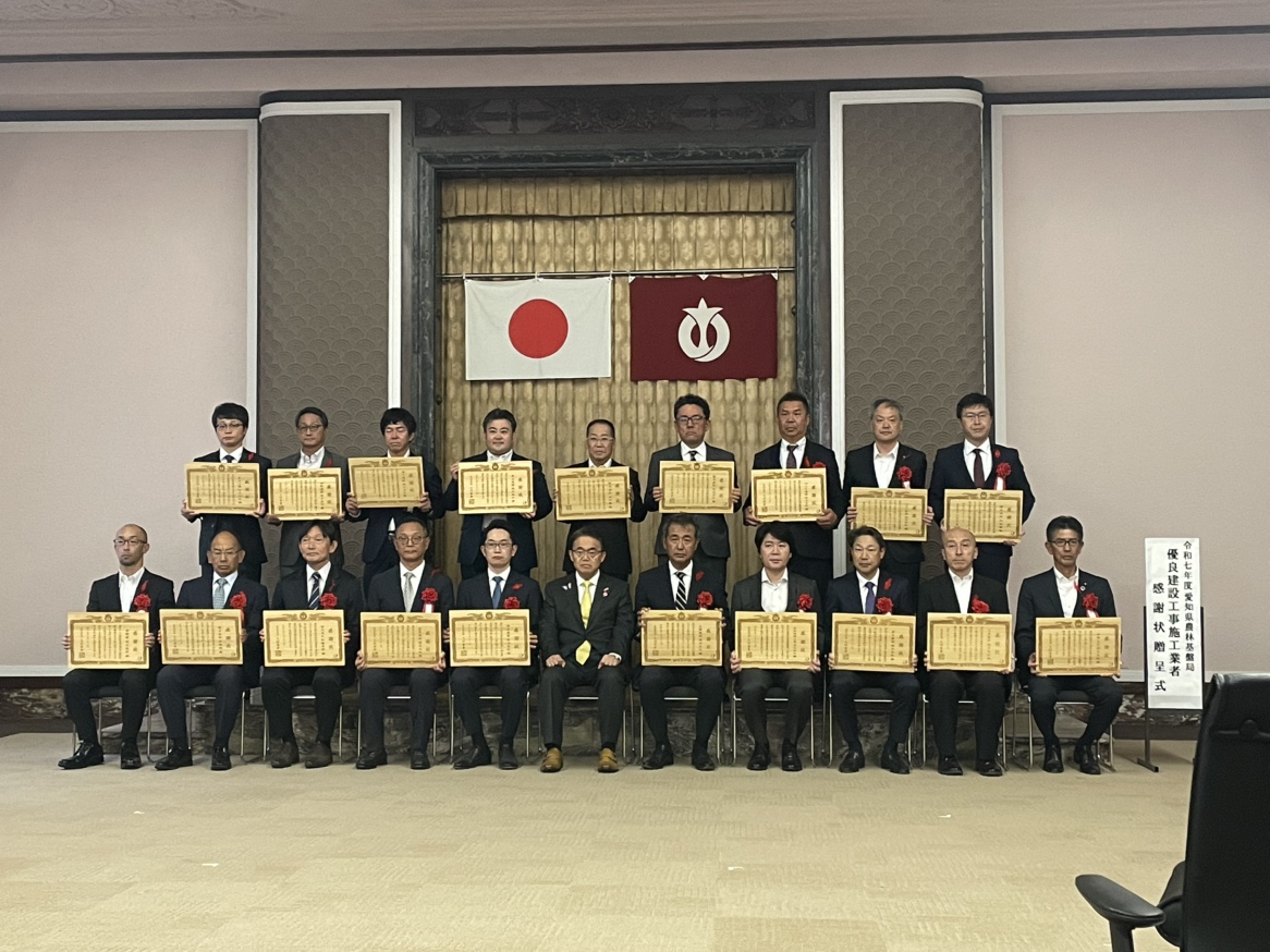 令和7年10月22日、愛知県庁にて『令和7年度 愛知県農林基盤局優良建設工事施工業者表彰 感謝状贈呈式』が開催され、優良建設工事施工業者として愛知県知事より感謝状を頂きました。