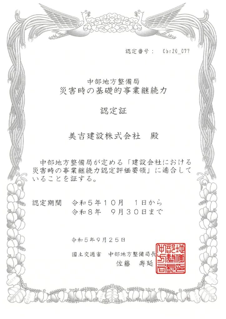 BCP(事業継続計画)とは、企業が緊急事態に遭遇したときに、資産の損害を最小限に抑えつつ早期復旧を可能とするために、平常時や緊急時における活動手段を取り決めておく計画のことです。当社は中部地方整備局よりBCPの認定を受けております。