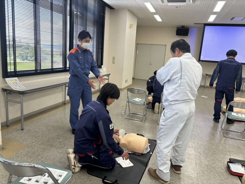 講習では、万が一の時に人命救助ができるよう心肺蘇生法の実技やAED(自動体外式除細動器)の操作方法など救命処置の知識・技術を学ばせていただきました。